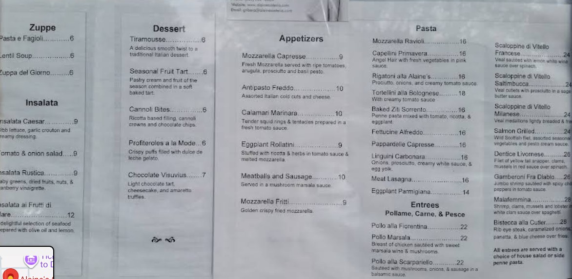 At Alaine's Osteria, we pride ourselves on serving authentic Italian cuisine made with the finest ingredients. Located in the heart of Palmetto Bay, FL, our menu features a wide selection of traditional dishes, from fresh pasta and handmade pizza to expertly crafted seafood and decadent desserts. Whether you're here for a family dinner or a special occasion, our welcoming atmosphere and delicious offerings promise to deliver a memorable dining experience. Browse our Alaine's Osteria Restaurant menu to discover your next favorite Italian dish today!