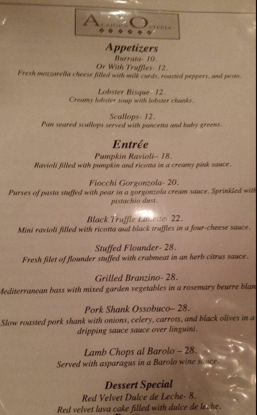 The restaurant is cozy, great for the family or a date.The food was flavorful and authentic just like my nonna used to make. The chicken parmigiana is amazing, their red sauce is robust and delicious, spiced to perfection, our waiter, Carlos, was very friendly and helpful, from beginning to end we loved our experience at this restaurant. The Tiramisu is a must try, decadent and creamy, so delicious! so leave some room for it at the end. Pardon my pictures, I was so eager to dig in, I forgot to take a picture of the food before I began to devour it. Thank you Alaine’s Osteria! We will be back in the near future